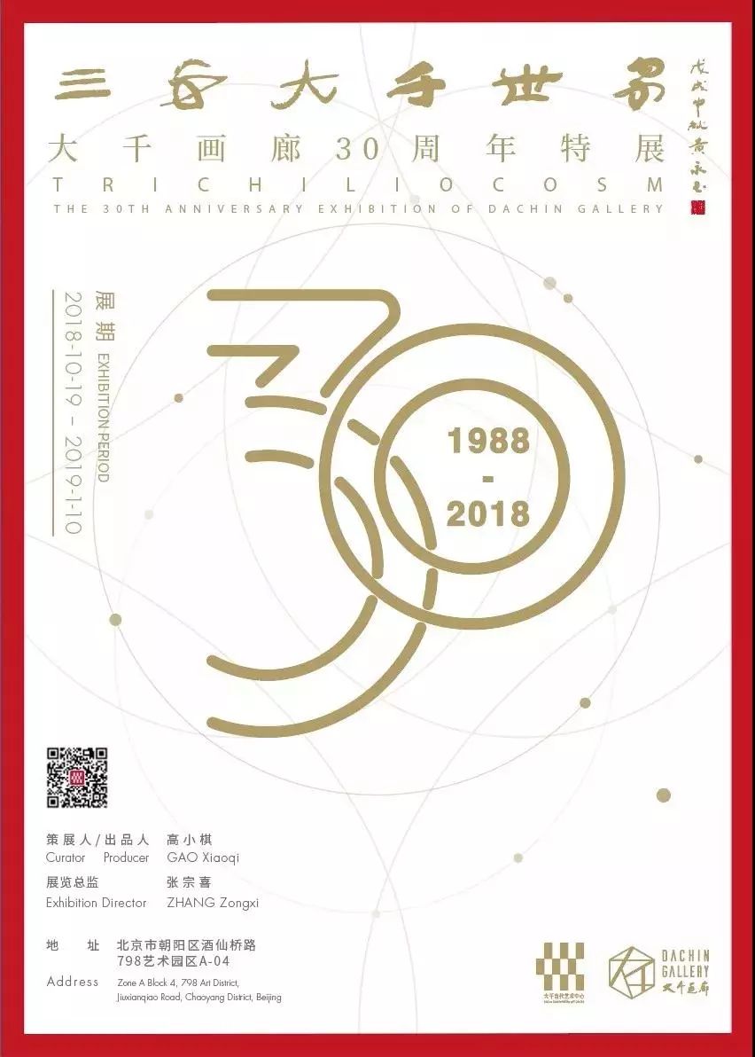 “三千大千世界--大千画廊30周年特展”于2018年10月19日至2019年1月10日在云北京市朝阳区酒仙桥路798艺术区A04栋 1-2F举行。在这次大千画廊“三千大千世界”30年馆藏展中,集结了二十世纪以来重要的美术名家,从乾隆御笔,早期的绘画巨匠徐悲鸿、齐白石、吴昌硕、刘海粟等到近代以来的诸多书画名家,凝聚了这一批画家最具代表性的作品,涵盖范围广、时间跨度大、作品数量多,我们试图以全新的视角讲述上个世纪中国画发展的百年历程,以杰出的画家们作为叙述的主体,以忠实于历史真实的方式,讲述一个百年中国画的故事,还原一个客观的、完整的时代。