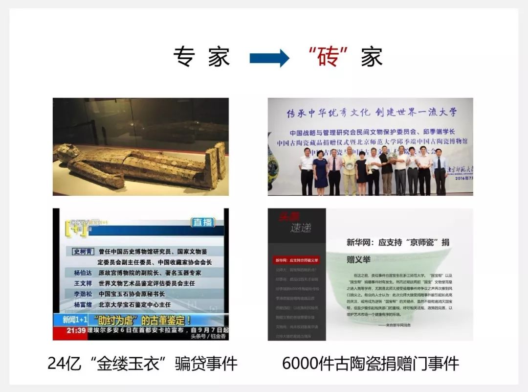 各种所谓“砖家”充斥市场,他们挂名于各鉴定、展览机构,开展了大量工作。有的藏品假的被说成真的,有的藏品真的被说成假的,可一旦因为鉴定错误而引发纠纷,当司法部门追究下来时,评判鉴定人法律责任的难度非常大。