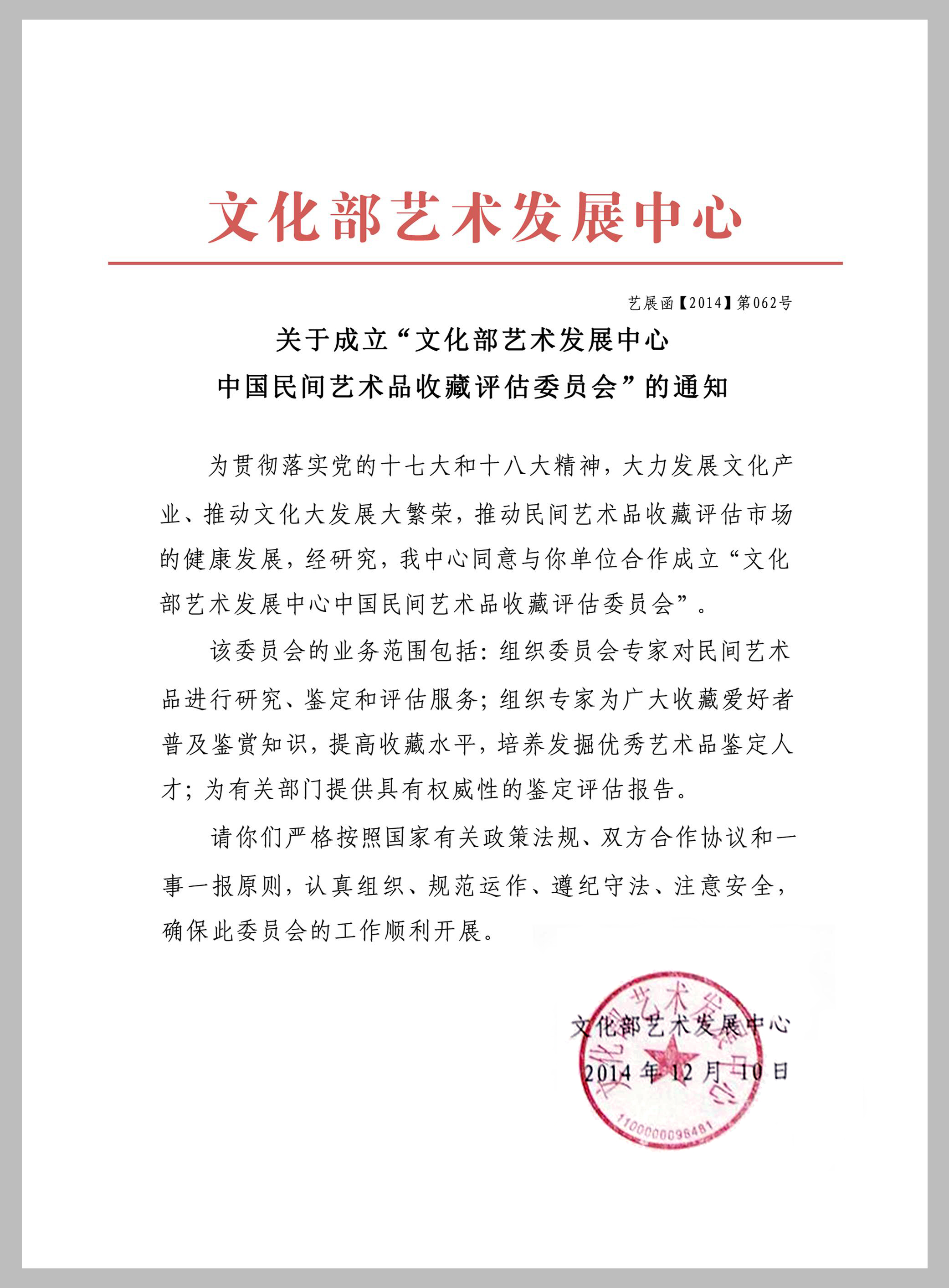 文化部艺术发展中心,经认真的组织准备,于2014年12月批准成立文化部艺术发展中心中国民间艺术品收藏评估委员会(艺展函【2014】第062号)。委员会前身为文化部艺术发展中心艺术品鉴定评估广东工作委员会。委员会聘请国内外有关科研和文化机构、高等院校、工商、海关、司法、行政监督机关等专家和专业人士组成,设有非物质文化遗产、书画雕塑、珠宝玉器、金属器、陶瓷器、综合艺术、科技检测、法律资讯等专业委员会,是在文化部有关司局指导下对文化艺术品开展鉴定、评估、培训、咨询服务的常设机构。
