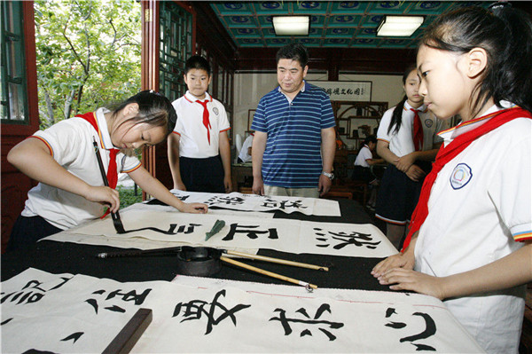 嘉宾在观看北京海淀区民族小学书法社团活动(2019年5月29日摄)。新华社记者 刘莲芬 摄