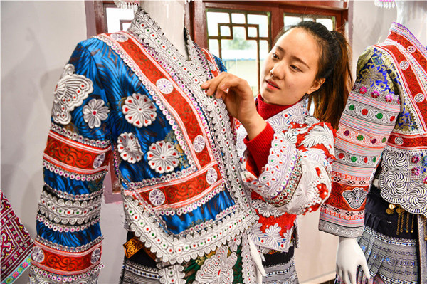 在贵州省毕节市黔西县新仁苗族乡化屋村麻窝寨易地扶贫搬迁集中安置点,苗族绣娘杨文丽整理苗族服饰(2021年2月20日摄)。新华社记者 杨文斌 摄