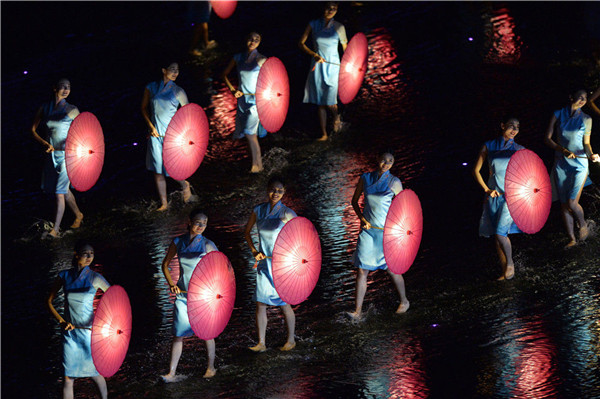 演员在西湖景区进行的G20杭州峰会文艺演出《最忆是杭州》中表演《难忘茉莉花》(2016年9月4日摄)。新华社记者 黄宗治 摄