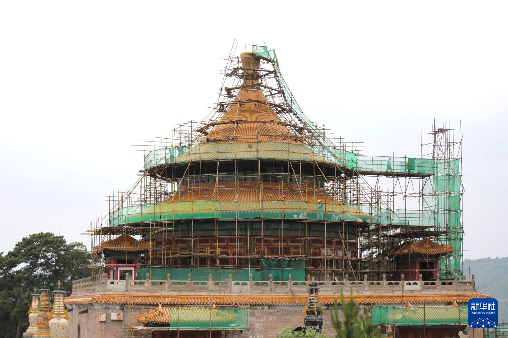 6月9日,工人在河北省承德市普乐寺旭光阁进行修缮施工。