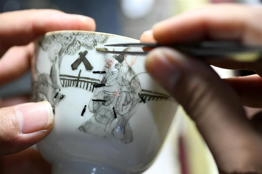 8月6日,河北省非物质文化遗产项目代表性传承人李军航为残破瓷嵌入锔钉。 锔瓷,就是修复破碎瓷器的技艺。中国有句俗语,叫“没有金刚钻,别揽瓷器活儿”,说的就是锔瓷这一门民间手艺。锔瓷匠人李军航是河北省第六批非物质文化遗产项目代表性传承人,他把中国传统书法与绘画文化融入进锔瓷技艺中,通过运用残瓷上的冲线或残缺,巧妙将锔钉嵌入其中,让破损瓷器恢复使用,提升了瓷器本身的艺术性。20多年来,李军航让有价值的陶瓷文物得以再生的同时,还将锔瓷技艺带进校园和社区,让更多人了解中国传统陶瓷文化,感受非遗技艺的魅力。