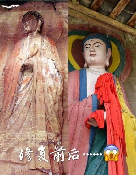 近日,有网友爆料称,四川安岳南宋时代的石刻文物佛像被重绘修复,并上传比对照片,质疑“现代社会竟有如此文物保护”。8月5日,安岳县政府官微发布情况说明,称1995年当地群众自发捐资,对峰门寺进行培修,修建了保护房30余平方米。由于缺乏文物保护意识,群众聘请工匠对龛内造像进行重绘,被时任安岳县文物管理所所长制止。近年来相关摩崖造像未出现重绘现象。从新闻图可以看出,原本古旧但古风犹存的石像,被涂成了庙会风——姹紫嫣红、唇红齿白。稍具审美意识的人都不难看出,这是一次失败的文物修复,一次成功的文物破坏。南宋石刻的珍贵,毋庸过分强调,出现如此景观,实在令人痛心。