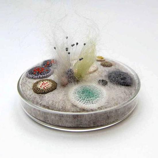 我们都见过霉菌,长毛的面包、坏掉的剩菜剩饭,很少有人仔细观察它们。英国艺术家Elin Thomas却用针毡等手工技艺,将被人忽略的微观世界真实展现了出来。她的大部分作品均采用真正的8厘米硼硅酸盐玻璃培养皿制作。她将微观世界的:真菌、苔藓、地衣用钩针、刺绣、毛毡等形式呈现出来,并做成摆件或者配饰。实在佩服这样的艺术家,可以运用大众的手法,去表达完全不同风格的作品,给人耳目一新的感觉。