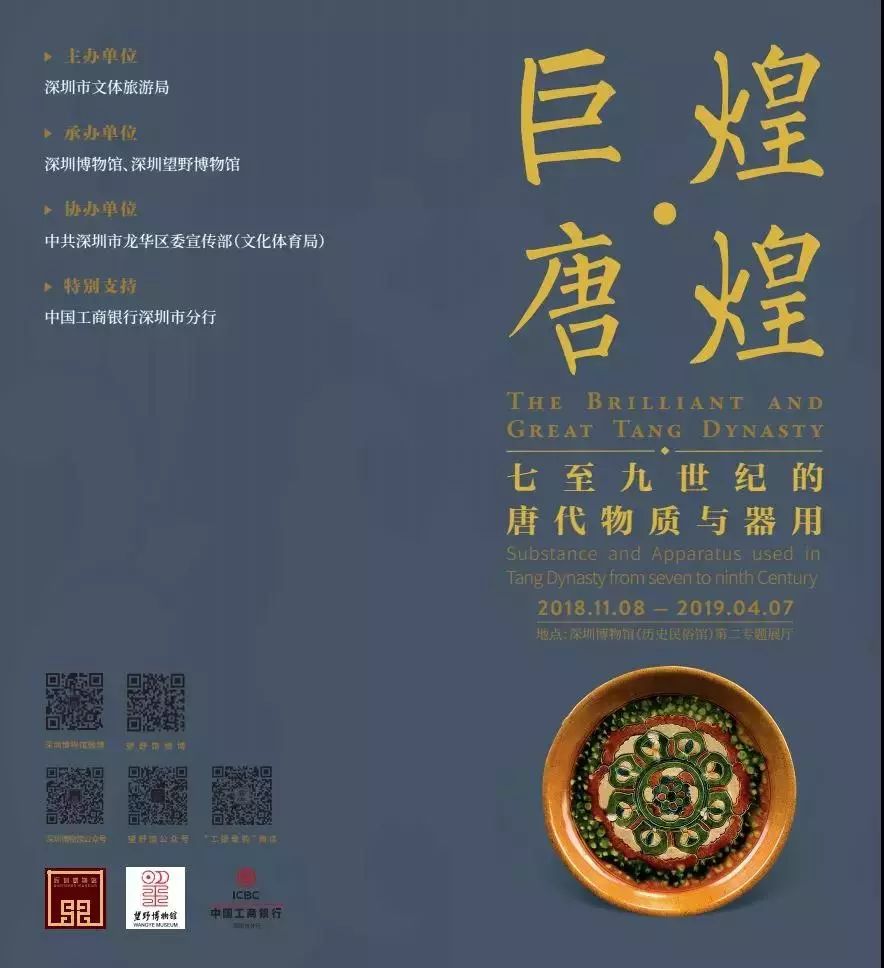 “煌煌·巨唐--七至九世纪的唐代物质与器用”于2018年11月日至2019年4月7日在深圳博物馆(历史民俗馆)举行。展览展出169件(套)珍贵的唐代文物,其中一级文物12件,二级文物2件。展品涵盖唐人物质文化生活,全方位展示1400年前大唐盛世的恢弘与壮美。本次展览以 “大历史观”和“以物证史”的概念建构为:河山万里、政通国泰、梵呗佛光、城坊百业和四海升平,五个单元。