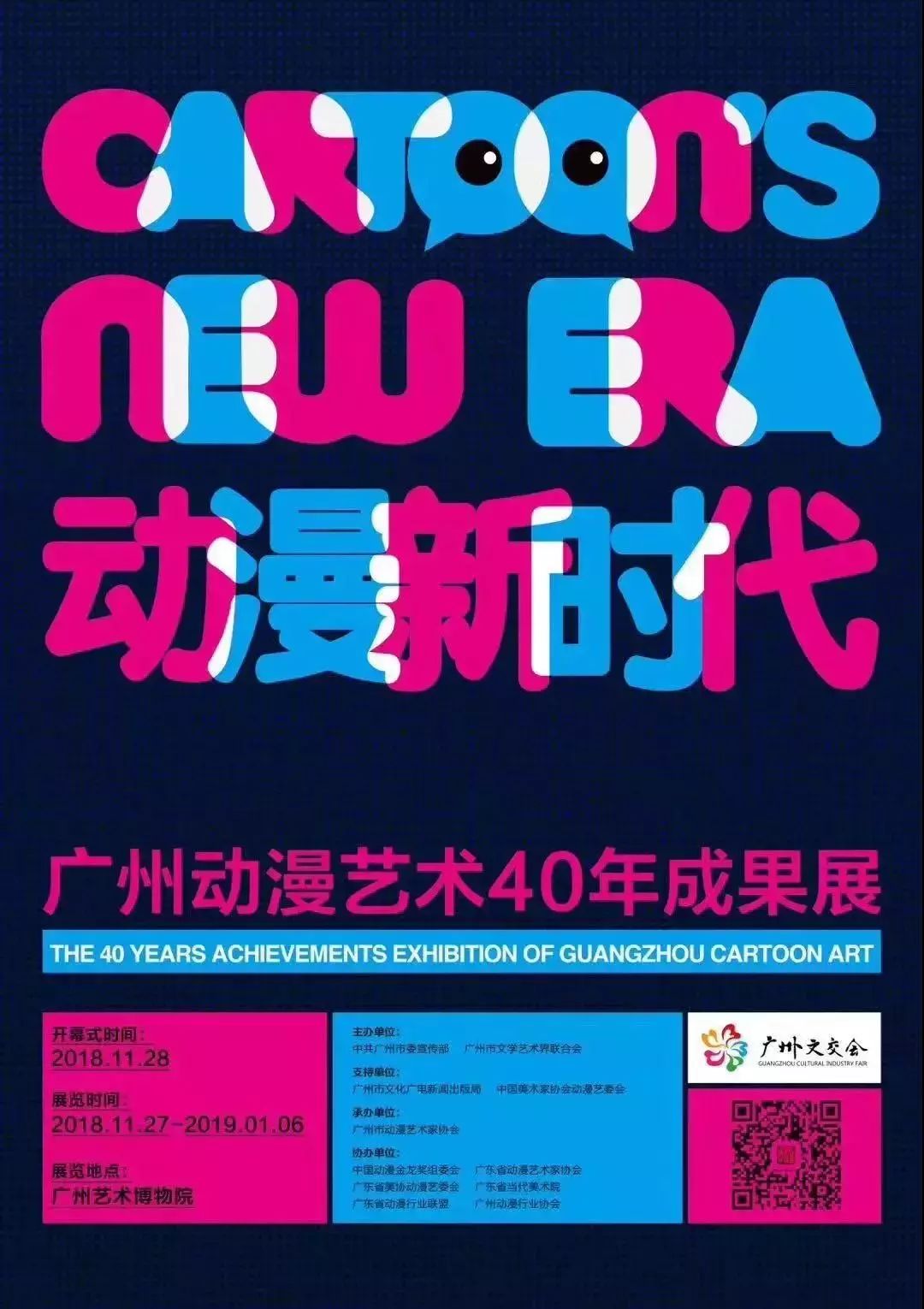 “动漫新时代--广州动漫艺术40年成果展”于2018年11月27日至2019年1月6日在广州艺术博物院国际交流厅举行。此次展览集结不同历史阶段的代表性作品、风云人物、典型案例,以及对应的史料、图表、大事记等文献,再现广州动漫40年走过的成长历程,彰显广州动漫艺术在中国动漫发展历程中的积极贡献和历史责任,鼓舞动漫艺术工作者与创业者再攀高峰,让时代记录征程,让经典成为永恒。