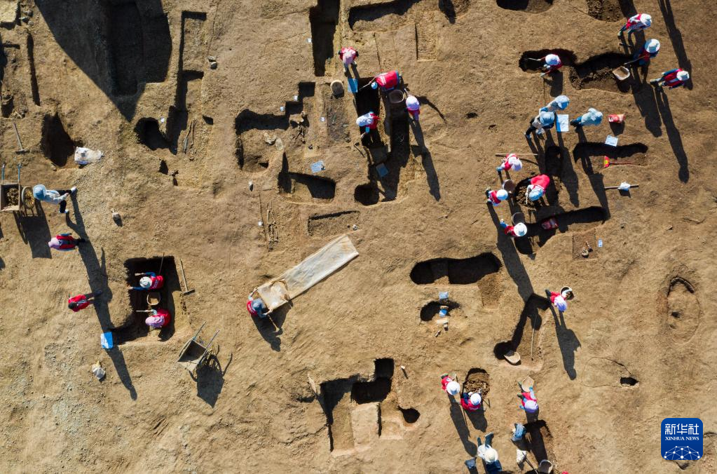 考古工作人员在盐源县老龙头遗址考古现场发掘(6月19日摄,无人机照片)。