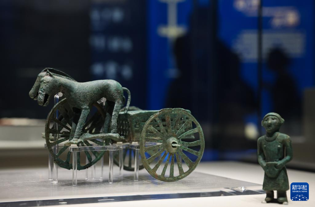 这是出土于盐源县老龙头遗址的铜车马和铜立人(6月18日摄)。
