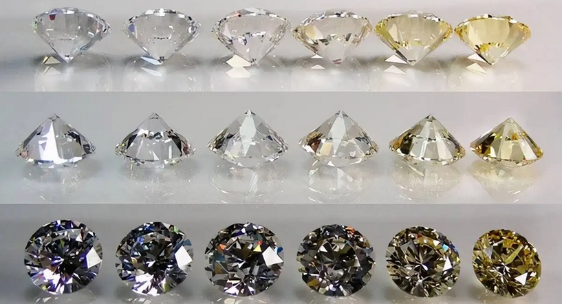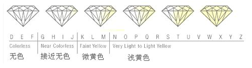 按钻石颜色从透明无色到浅黄色的变化划分为12个连续的颜色级别,用英文字母D-Z代表不同的色级。