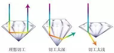 光线到达不同切工的钻石后走向,后两者都会漏光