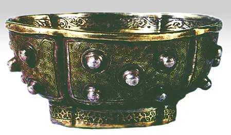 宋朝金银器一般较为小巧,胎体轻薄,常见仿古器物。器物成型多依靠钣金,有时也采用夹层法。采用夹层法的器物仅用两片金属片打造,金属片之间留有空隙,这样就能以较少的材料打造出厚重的效果。