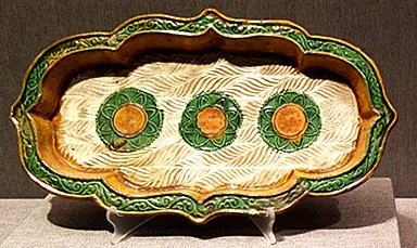 此件三彩釉印牡丹双蝶纹海棠式长盘,便是一件带有中原审美特征的辽代陶器。