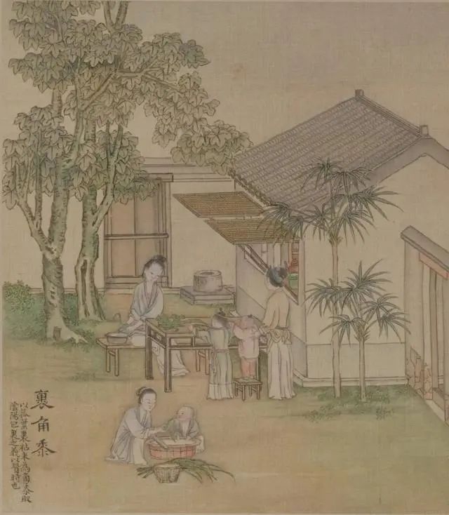 图画里写道:“以菰叶裹粘米为角黍,取阴阳包裹之义,以赞时也。”画里妇女带着小儿们一同包粽子,充满了家常之乐。