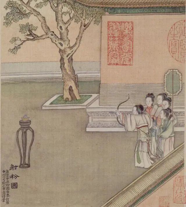 宫中每到端午节,就流行射粉团。所谓射粉团,就是把做好的粉团当成靶子,张弓搭箭来射,射中了就得吃。可以想象,游戏现场必然充满欢声笑语。