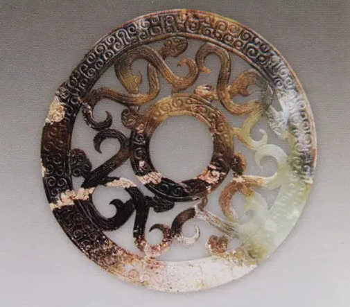 春秋战国·透雕蟠螭纹玉璧的黑色沁 湖北荆州熊家冢墓地出土