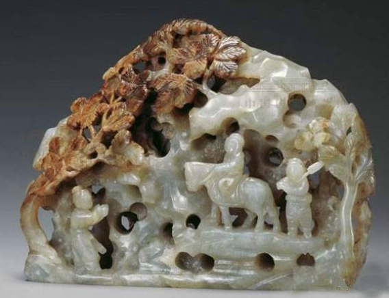 像这件人物山子,巧妙地把黄褐色玉皮雕刻成树叶,表现出层林尽染的秋山景象。