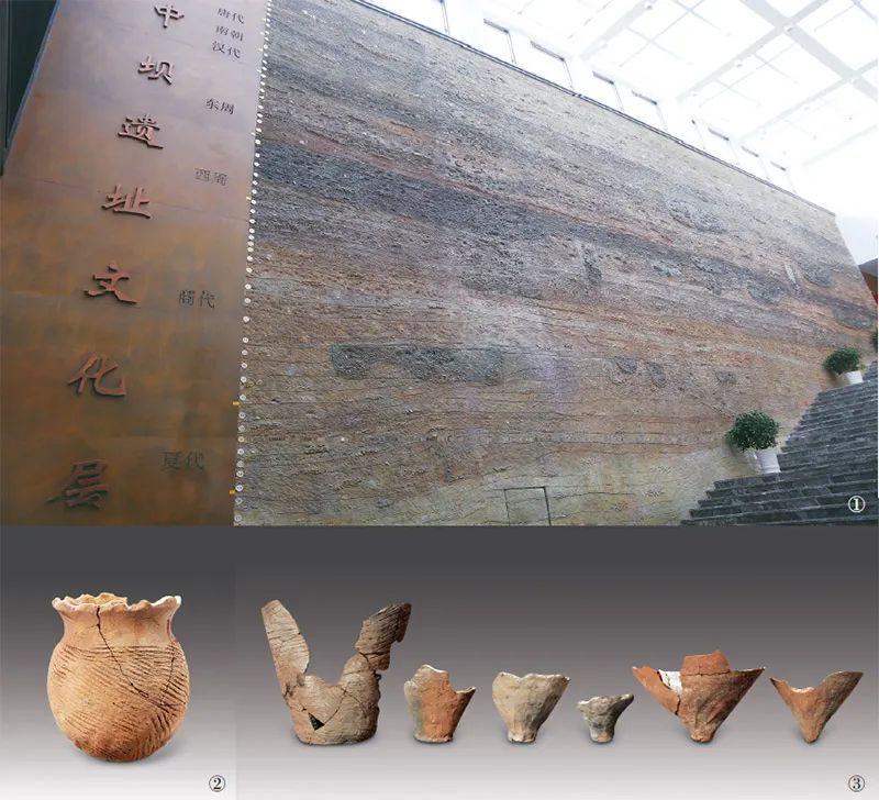 重庆中坝遗址出土的地层文物,完整包含了新石器时代晚期、夏商周、秦汉、魏晋南北朝、唐宋元明清不同时代的所有地层,可以让人们直观感受到中华五千多年文明绵延不绝的伟大与震撼。图1为中坝遗址剖面还原图(图片来源:重庆市忠县县委宣传部)。图2、图3分别为中坝遗址出土的制盐陶器花边口圜底罐、花边口尖底缸底(图片来源:科学出版社)。