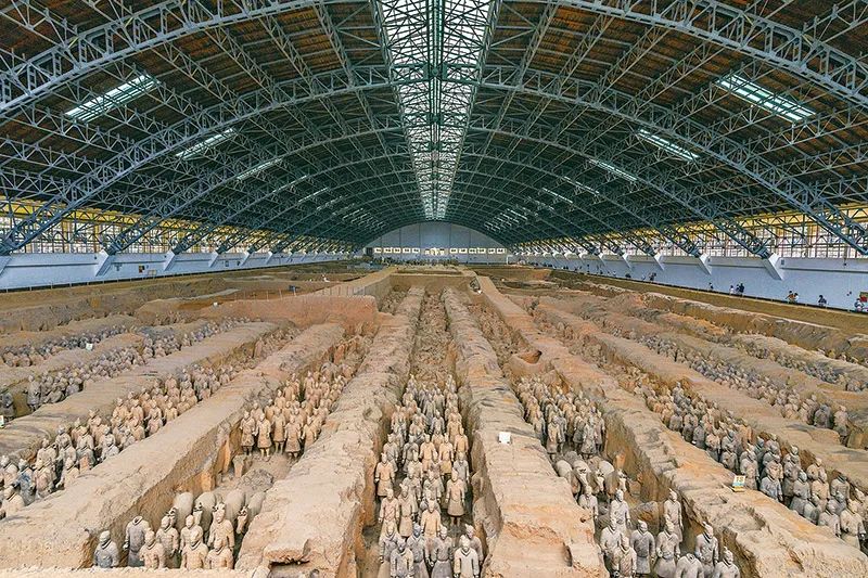 秦始皇陵是中国历史上第一个多民族的中央集权国家的皇帝秦始皇于公元前246年至公元前208年营建的。作为秦始皇陵陪葬墓坑之一的兵马俑坑于1974年被发现,被誉为“世界第八大奇迹”。图为秦始皇兵马俑博物馆一号坑全景。 人民图片 丁俊豪/摄