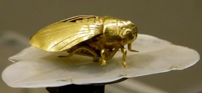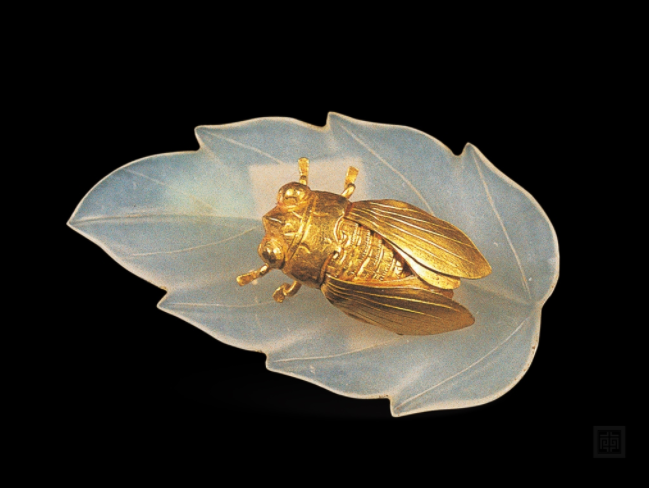 俗话说“金蝉脱壳”,蝉因为能“破茧重生”,其形象常常作为随葬品出现,寓意墓主人转世重生。 “金蝉玉叶”式发簪的出土,在当时是里程碑式的成就,直到如今,依然没有相同样式的器物出土,堪称“一绝”,被评为南京博物院的镇馆之宝。