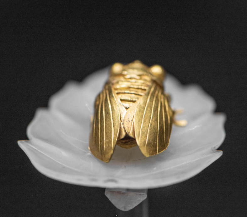 金蝉部分含金量达到九成以上,是工匠采用压模铸范、薄叶延展、錾刻、焊接等工艺打造而成。此蝉形神毕肖,蝉翼轻薄,微微张开,纹路缕缕分明,就好像随时要展翅飞走一般。
