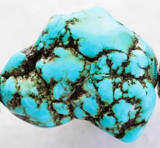 绿松石内的铁杂质有时会形成褐黑色的“铁线”,这样的绿松石被称为“铁线绿松石”或“蓝缟松石”。