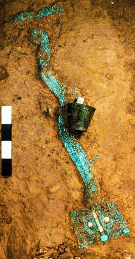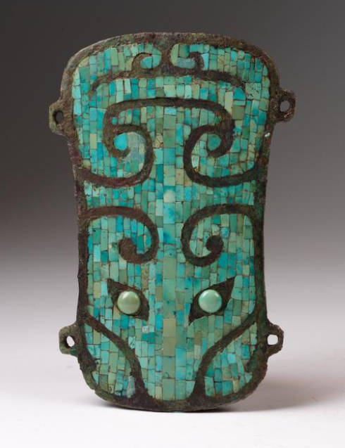 在我国,也出土了不少镶嵌绿松石的珍贵文物,例如下面这曾轰动一时的嵌绿松石铜牌饰,这件器物出土于河南二里头遗址,是多件嵌绿松石铜牌饰中的一件,其年代约为距今3800~3500年,相当于古代文献中的夏、商王朝时期。