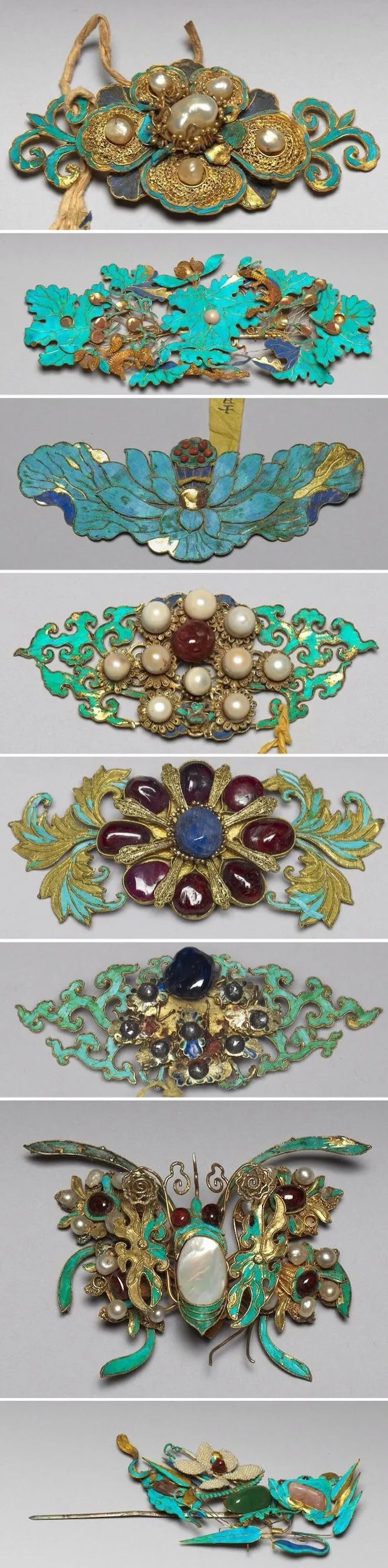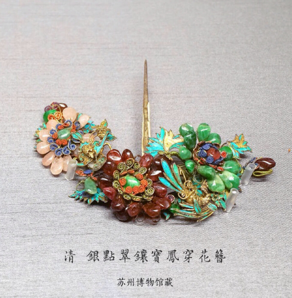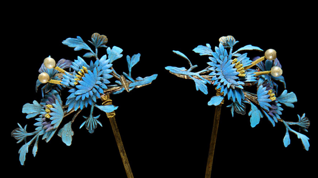 这些五彩斑斓的头饰,都应用了中国传统的“点翠”工艺,是用翠鸟的羽毛镶嵌在金银首饰上,起到点缀作用的一种工艺。