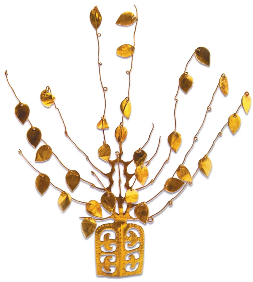 下面这件花树状金步摇,可是把“摇动”的效果发挥到了极致,这些挂在“树枝”上可活动的金叶子,走动时会如同随风颤动的树叶一样发出声响。