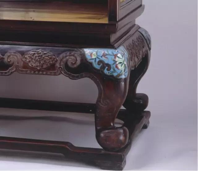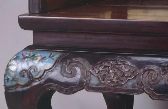 该宝座的制作年代应在清代中晚期。现藏于上海博物馆,保存较为完好,做工精细,所以这张宝座也稍稍会详细阐述。说其是清代中晚期,有三大论点可述:一是通体用红木制作,而红木(酸枝木)的使用一般来说自清代中期开始逐步流行起来;二是清代装饰工艺中的染牙比百宝嵌使用时间相对要晚,从传世实物看,这一工艺多见于清代中晚期;三是该椅三弯腿用材粗壮,特别是其足部十分臃肿,与清式家具早、中期三弯腿相比显得笨拙而无韵律,这是中国传统家具进入衰微时期出现的一种初步现象。从造型风格上说,该宝座做三屏风围子。后背搭脑部位形同罗锅枨,两侧至扶手依次递减。座屉硬板,下有束腰,牙条膨出,上开光内浮雕吉祥果。腿为三弯腿,肩部包裹铜掐丝珐琅。足下置罗锅枨式托泥。该宝座屏面贴金嵌染牙组成的寿桃、佛手、石榴,旁以蝙蝠衬托。整个画面金碧辉煌,富贵呈祥。清代家具的装饰名目繁多,其中十分重要的一条是望图附会,因物名而捏造物宜,这是民间习用的于法。就本椅而言,它取用的桃子、佛手、石榴与蝙蝠,是清代中期以后最流行、最典型的吉祥物题材。