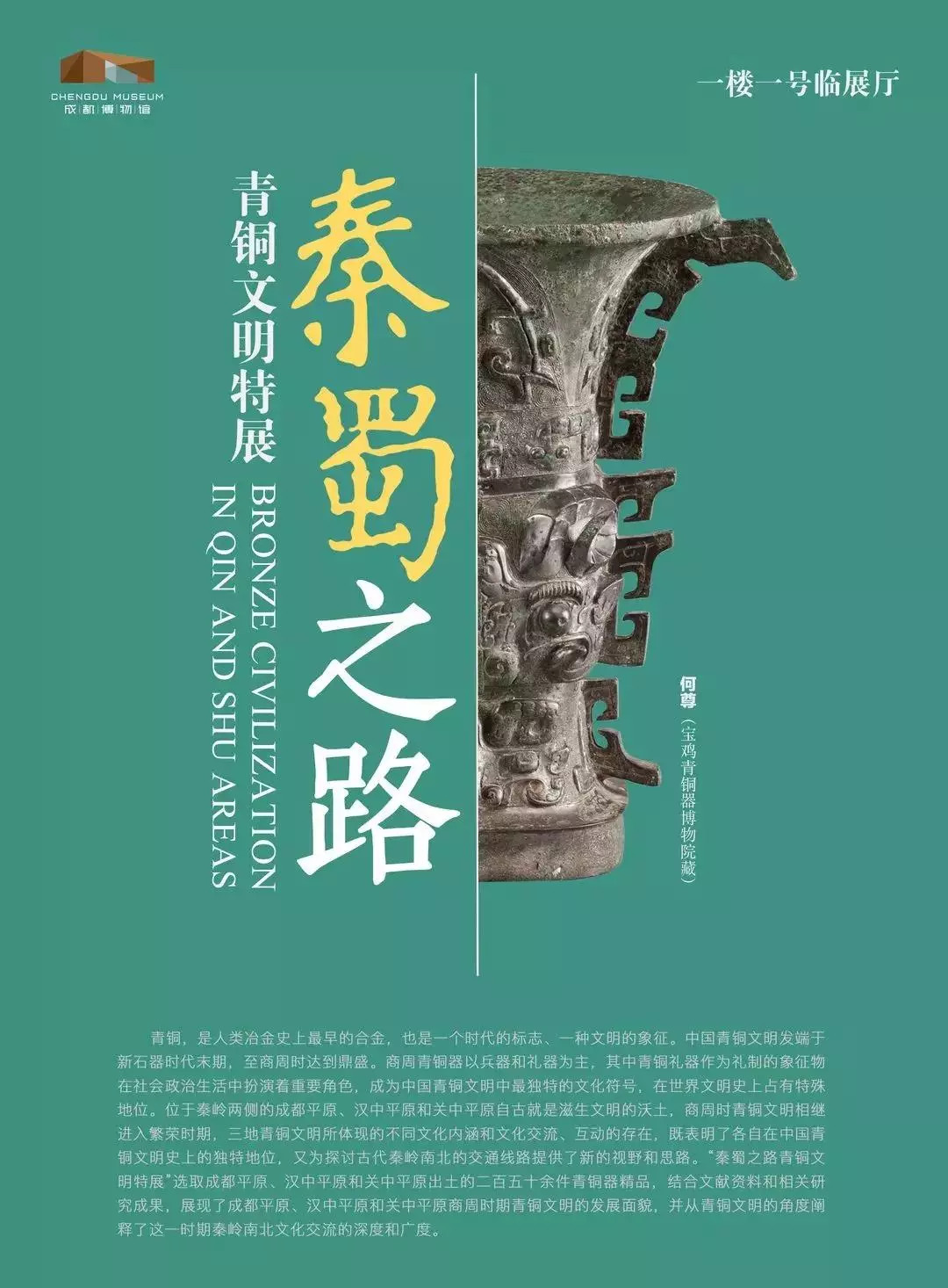 “秦蜀之路青铜文明特展”于2018年7月27日至2018年11月11日在成都博物馆1楼1号临展厅举行。本次展览中集结了来自成都平原、关中平原、汉中平原三地的青铜器,共计250余件,其中包括了55件一级文物。位于秦岭两侧的成都平原、汉中平原和关中平原自古就是滋生文明的沃土,商周时期青铜文明相继进入繁荣时期,三地青铜文明所体现的不同文化内涵和文化交流、互动的存在,既表明了各自在中国青铜文明史上的独特地位,又为探讨古代秦岭南北的交通线路提供了新的视野和思路。展览集结了三个地区最具代表性的青铜器,讲述了青铜时代地域间的差异与交流。