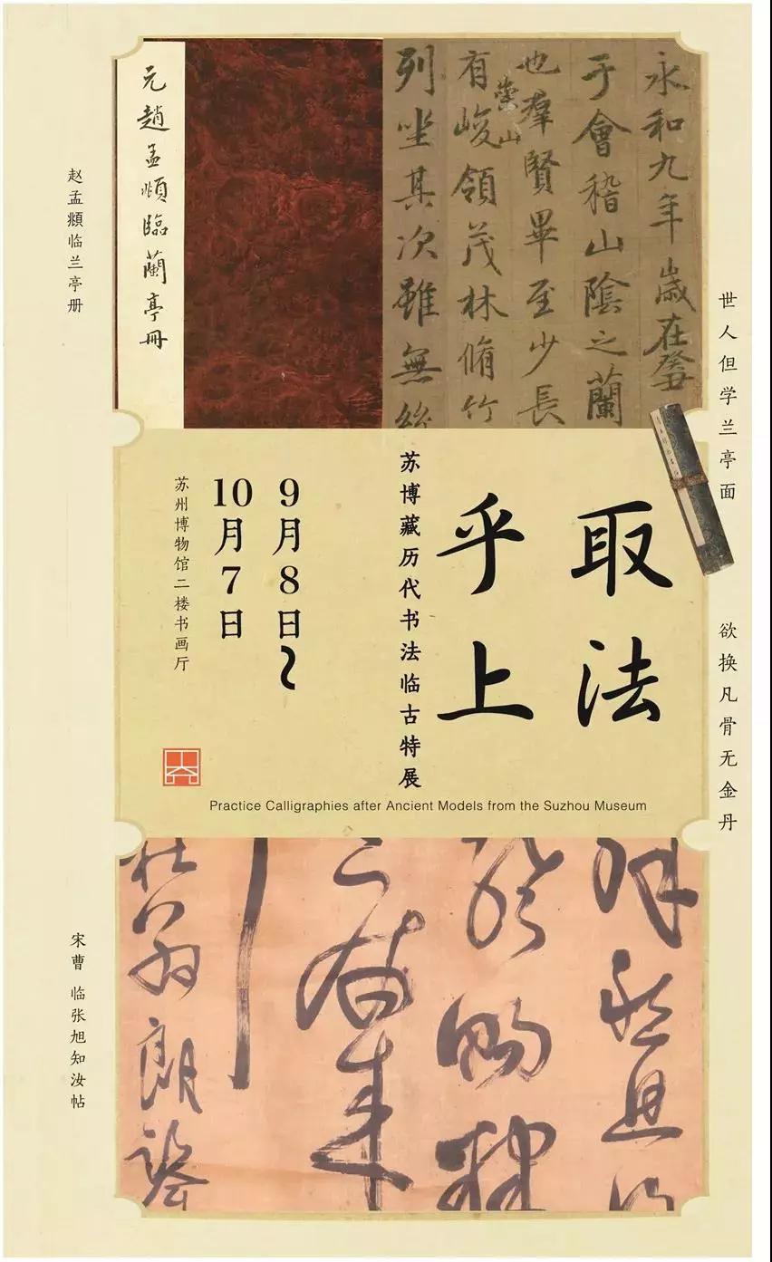 “取法乎上--苏博藏历代书法临古特展”于2018年9月8日至2018年10月7日在苏州博物馆二楼书画厅举行。苏州博物馆藏有不少元明以来的名家临古之作,本次展览即特别遴选其精妙者凡三十余件,兼真草篆隶之体、备卷轴屏册之式。其中若赵孟頫之临《定武兰亭》、女史曹贞秀之临《玉版十三行》、无名氏之临《智永千字文》,皆属名家旧藏,堪称难得一见的铭心之物;而王铎、姜宸英之临《阁帖》、王澍之临《米帖》、吴昌硕之临《石鼓文》等,或形神俱肖、或略参己意,诸家日常临池之用功,于此即可窥一斑。