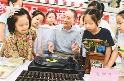 9月23日,江苏省镇江市宝塔路街道运河社区开展“晒晒老旧物品 喜话生活变迁”主题活动,邀请老党员为小朋友讲解老旧电器、老票据、老照片、煤油灯等各种老旧物品,让孩子们感受改革开放以来百姓生活的巨大变化。图为老党员在向小朋友介绍老式电唱机的使用方法。
