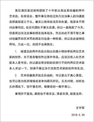 近日,有微博爆料称演员袁立在朋友圈发布,其在十年前在华谊兄弟传媒股份有限公司创始人、董事长王中军处购买的艺术品是伪作。5月30日16:07,王中军通过@华谊兄弟 官方微博发表了回应:“事情并不复杂,真假也不难求证。清者自清,就是这样。 ”他指出袁立提及的两件艺术品分别是魏小明与李凯两位艺术家的创作,建议找两位艺术家本人求证,并认为艺术收藏是开放自由的,应该保持一颗平常心。