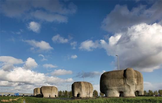 荷兰艺术家Tom Claassen从事艺术活动已超过25年,主要以公共场所创作的作品闻名,几乎每个生活在荷兰阿尔梅勒[Almere]的人都在A6高速公路上看到过他创作的这组家庭大象,该项目由荷兰公共工程和水管理局委托,由Claassen团队于2000年设计建成,艺术预算1202896美元,混凝土、青铜材质,每个大象的尺寸约700 x 700 x 1100厘米。Claassen的作品往往是沿着文化与自然的交界处,牢牢扎根在雕塑的传统之中,同时又具有原创性、趣味性和个人风格,在公共场所的作品,尽管体量很庞大、但却很可爱。正是这种极端的放大,造成了景观或城市景观的中断,而动物的自然、柔软、圆润的形态,更容易让人亲近与抚摸着它们。