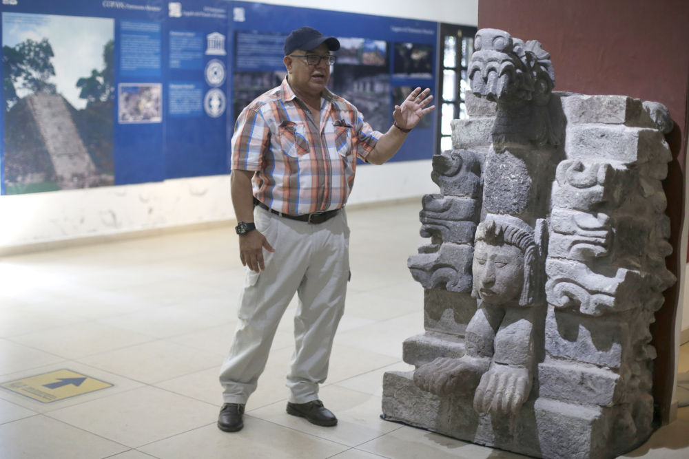 2023年6月8日,在洪都拉斯科潘遗址入口陈列厅,洪都拉斯人类学和历史研究所西部地区代表萨尔瓦多·马丁内斯介绍联合考古队发现的龙头雕像。新华社发(卢西奥·塔沃拉/摄)