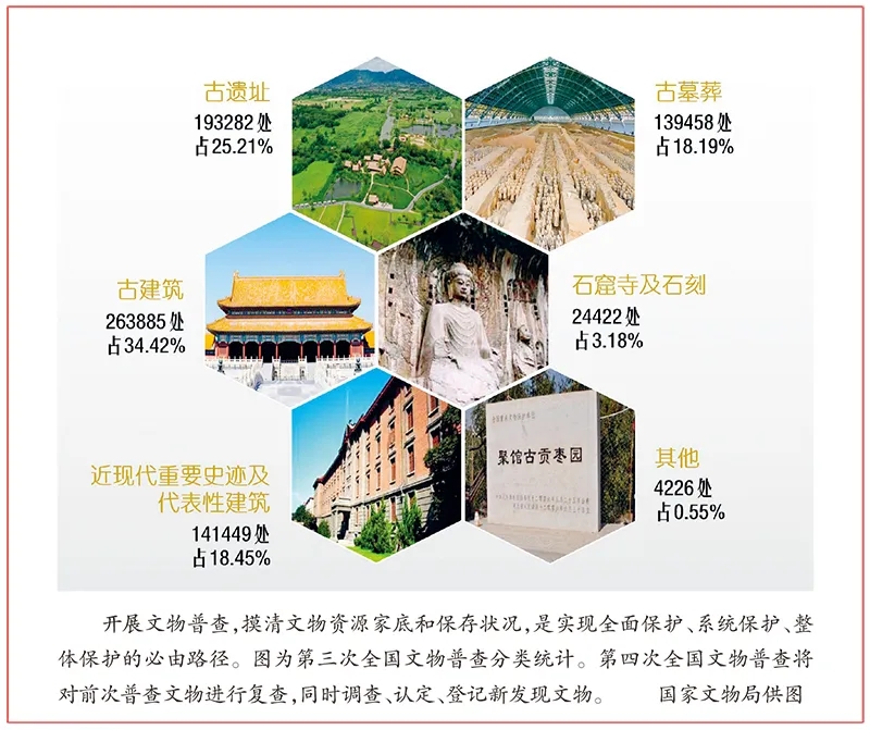 构建文化遗产大保护格局,对文物系统性保护提出了新的更高要求。作为物质文化遗产保护的“重中之重”,新时代文物保护正在从重点保护向全面保护、系统保护、整体保护转变。我国分别于1956年、1981年、2007年开始开展过三次全国文物普查。今年的《政府工作报告》提出:“开展第四次全国文物普查,加强文物系统性保护和合理利用。”当前,按照新时代加强文物和文化遗产系统性保护工作要求推进的第四次全国文物普查,采取了一系列新举措:践行应保尽保,将1911年以前的古建筑、古文化遗址、古墓葬、石窟寺及石刻全部纳入普查和认定范围;丰富文物内涵,将六大类59项文物类别细化扩展为63项,首次明确将文化景观纳入普查对象;推动系统保护,将开展不可移动文物认定、登记和公布列为主要任务,把普查成果作为各行业名录公布的基础,为构建以文物资源为核心的历史文化遗产保护体系提供有力支撑。