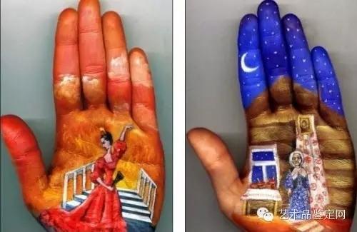 俄罗斯的一位艺术家十分热衷在手掌上作画,本来平淡无奇的画作因为手掌的纹理显得立体形象,连人物的表情都生动起来。