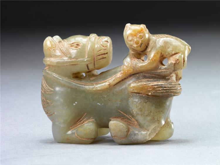 青玉“马上封侯”,马伏卧于地,马头回转,马尾横摆于后腿之上,马颈部、尾部用阴刻线刻画鬃毛。马背部镂雕一卧猴,目视前方,前肢搭于马背缰绳之上。整器刻画简单,但不失活泼可爱的神韵。