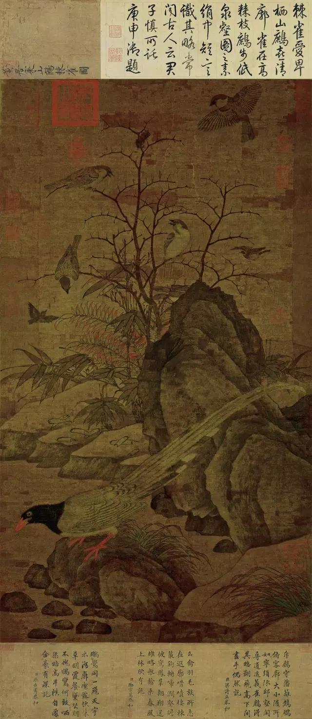 图中画水边数石叠起起的岸上,所有景物,其上都布满积雪,皑皑一片,柳枝竹叶亦在积雪中努力伸展。池塘上,雾气一片,水天一色,一片清寒静寂的景致,在静寂中又寓有生机。画中笔法奇峭,精细而又简洁,石的画法简练含蓄,竹树则枝叶具体,而寒鸟和双鸭则更生动传神。画中用墨洁净,设色简淡,是一种与其精工富丽完全不同另一种画风。
