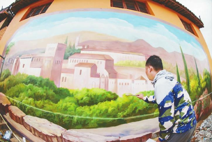一、2015年下半年以来,云南省丽江市七河镇金龙村通过统一规划,为村里的442栋庭院式房屋陆续刷上了9种颜色的彩绘,有的墙壁还画上了大幅的3 D立体画,让这个深山坝子中的村落充满了艺术气息。