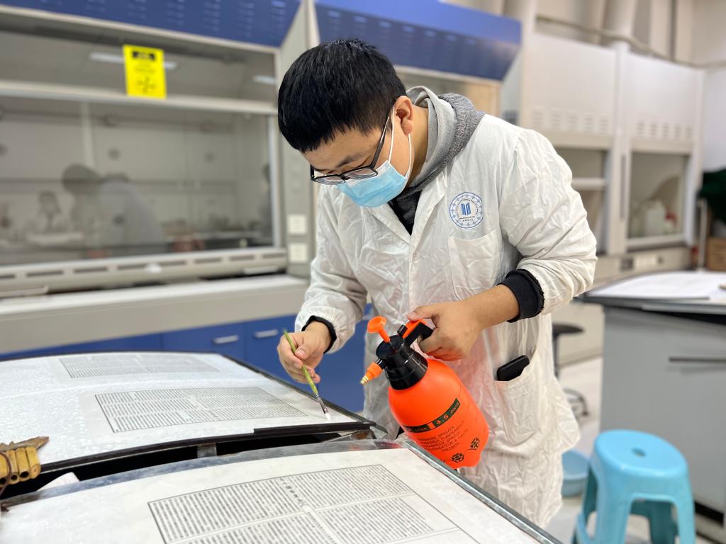 古籍修复师武栋在陕西师范大学纸质文献修复与保护研究室里修复古籍。新华社记者 蔡馨逸 摄