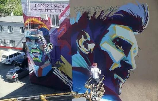 • 梅西下榻酒店旁是C罗壁画 艺术家连夜赶制梅西画像