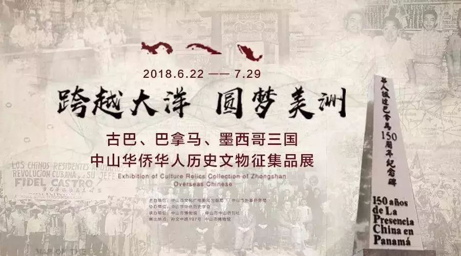 跨越大洋 圆梦美洲——古巴、巴拿马、墨西哥三国中山华侨华人历史文物征集品展于2018年6月22日至2018年7月29日在中山市博物馆举行。本次展览精选了从古巴、巴拿马、墨西哥三国征集的100余件(套)珍贵实物,既追溯了三国早期华侨筚路蓝缕,创业奋斗的传奇历史。