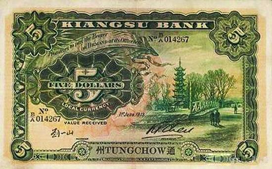 图1 民国二年(1913)江苏银行发行的伍圆兑换券,由英国印钞公司印制,背图为上海龙华塔。