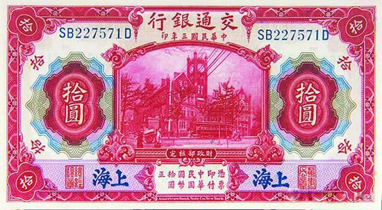 图2交通银行,其发行的拾圆券,印有上海汉口路外滩教堂式关署的图案。