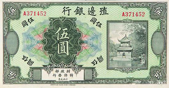 图3 殖边银行于民国七年(1918年)发行的伍圆券,印有上海嘉定汇龙潭奎星亭的图景。