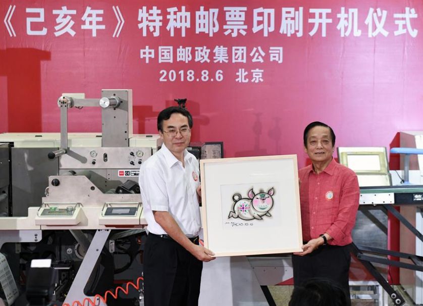 8月6日,著名艺术家韩美林(右)向中国邮政集团公司董事长刘爱力赠送《己亥年》生肖邮票设计原稿。 当日,《己亥年》特种邮票印刷开机仪式在北京举行,揭晓了《己亥年》特种邮票的设计图稿,并正式启动印制。 据了解,《己亥年》特种邮票由著名艺术家韩美林担纲设计,一套两枚,图案名称分别为“肥猪旺福”和“五福齐聚”,将于2019年1月5日正式发行。