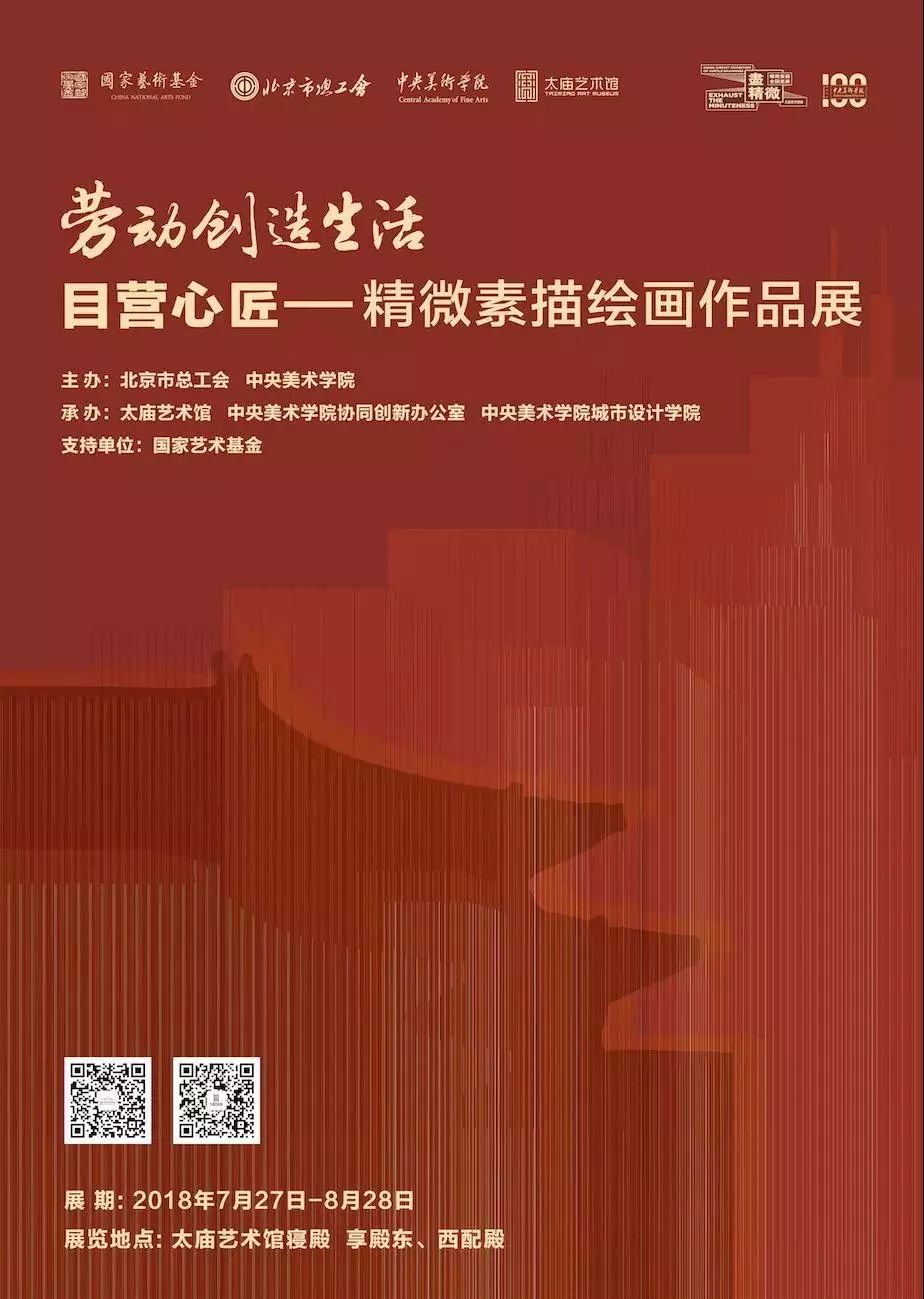 “劳动创造生活:目营心匠--精微素描绘画作品展”于2018年7月27日至2018年8月28日在太庙艺术馆寝殿、享殿东、西配殿举行。展览作品以中央美术学院历年收藏的精微素描和素描笔记绘本为主体,同时,以“北京老字号品牌”为形象,新创作素描笔记绘本6组,辅以25件静物实物,共百余幅作品,将精微素描震撼的视觉效果和背后的温暖故事传递给社会大众。艺术家用创造性的艺术劳动,赋予我们讲述北京传统技艺、传承工匠精神,弘扬“劳动光荣”价值理念更加生动、美丽的载体。
